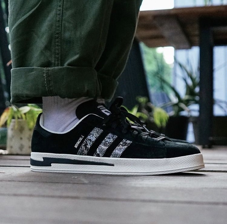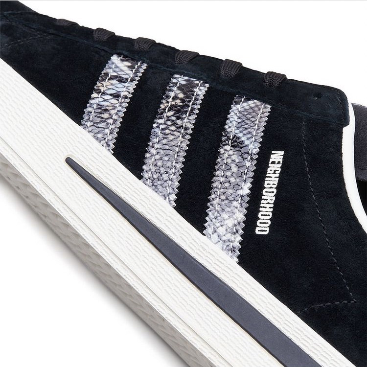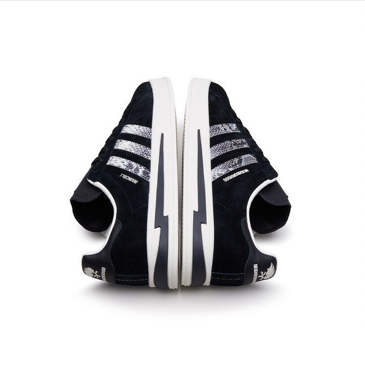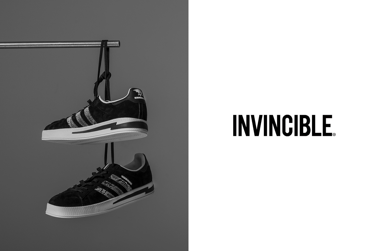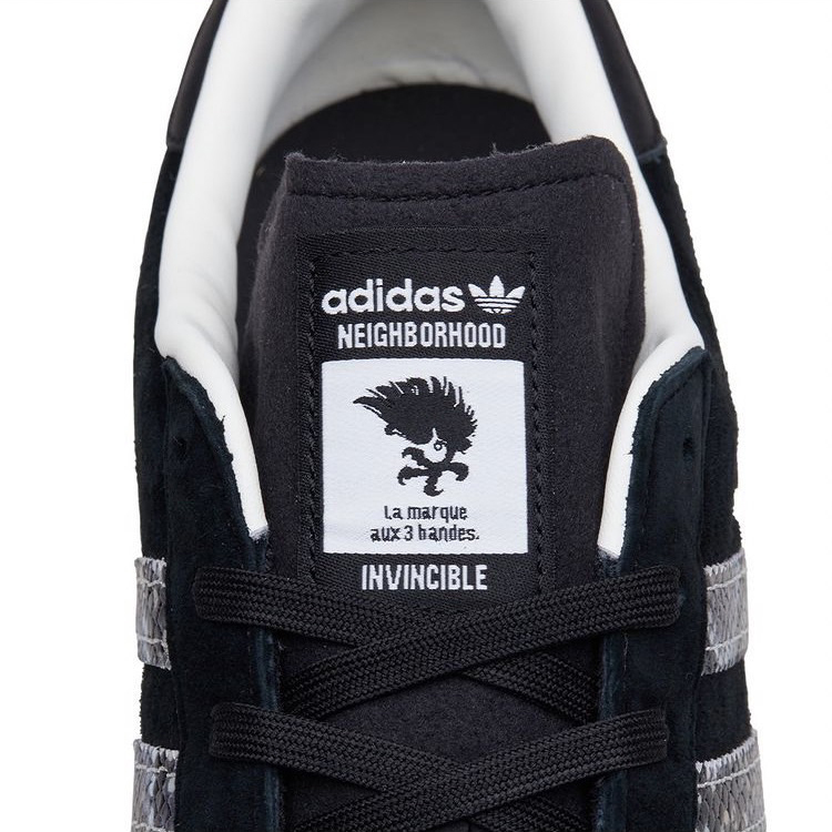 ★ 本番三方聯手打造的鞋款選擇了 adidas Originals 經典且搭配性十足的 campus,INVINCIBLE 本次特意將兩者過往的經典元素結合:2006 年為德國世界杯專屬打造的 NEIGHBORHOOD x adidas Gazelle Berlin 以及 2017 年 INVINCIBLE 十週年的 INVINCIBLE x NEIGHBORHOOD x adidas NMD-R1。前者環繞後半部中底的閃電與鳳凰標誌暌違 15 年再次回歸,繼承兩者黑色系鞋身的同時採用獨特蛇鱗 Three Stripes 點綴。