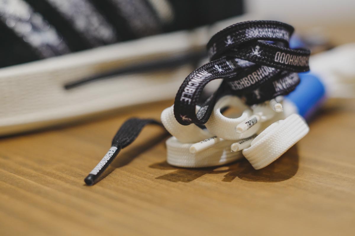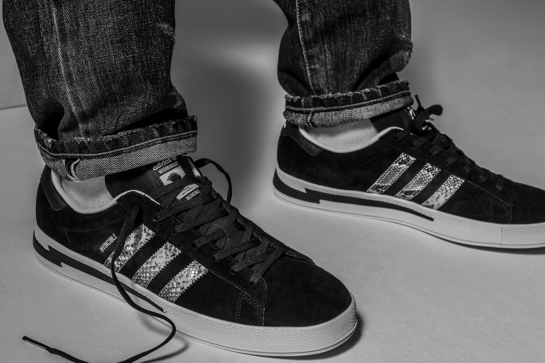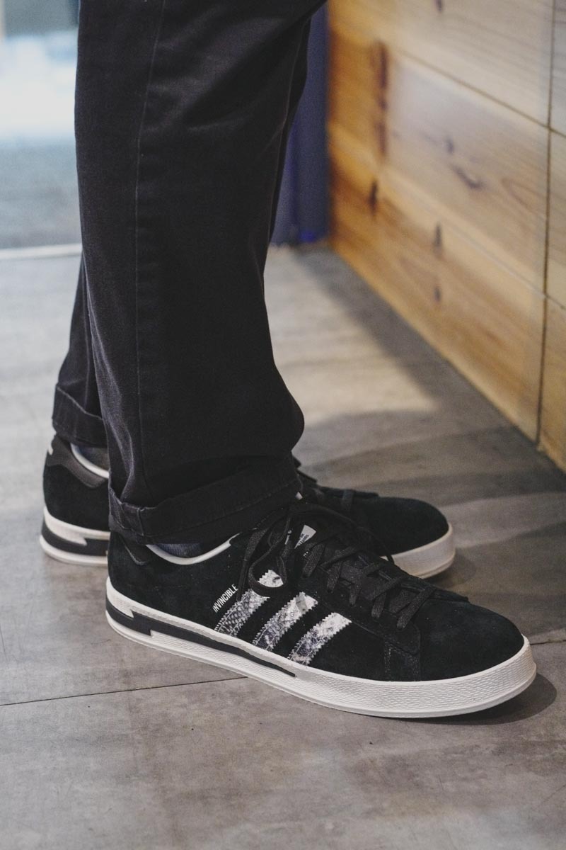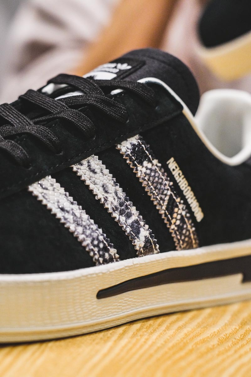 ★ 本番三方聯手打造的鞋款選擇了 adidas Originals 經典且搭配性十足的 campus,INVINCIBLE 本次特意將兩者過往的經典元素結合:2006 年為德國世界杯專屬打造的 NEIGHBORHOOD x adidas Gazelle Berlin 以及 2017 年 INVINCIBLE 十週年的 INVINCIBLE x NEIGHBORHOOD x adidas NMD-R1。前者環繞後半部中底的閃電與鳳凰標誌暌違 15 年再次回歸,繼承兩者黑色系鞋身的同時採用獨特蛇鱗 Three Stripes 點綴。
