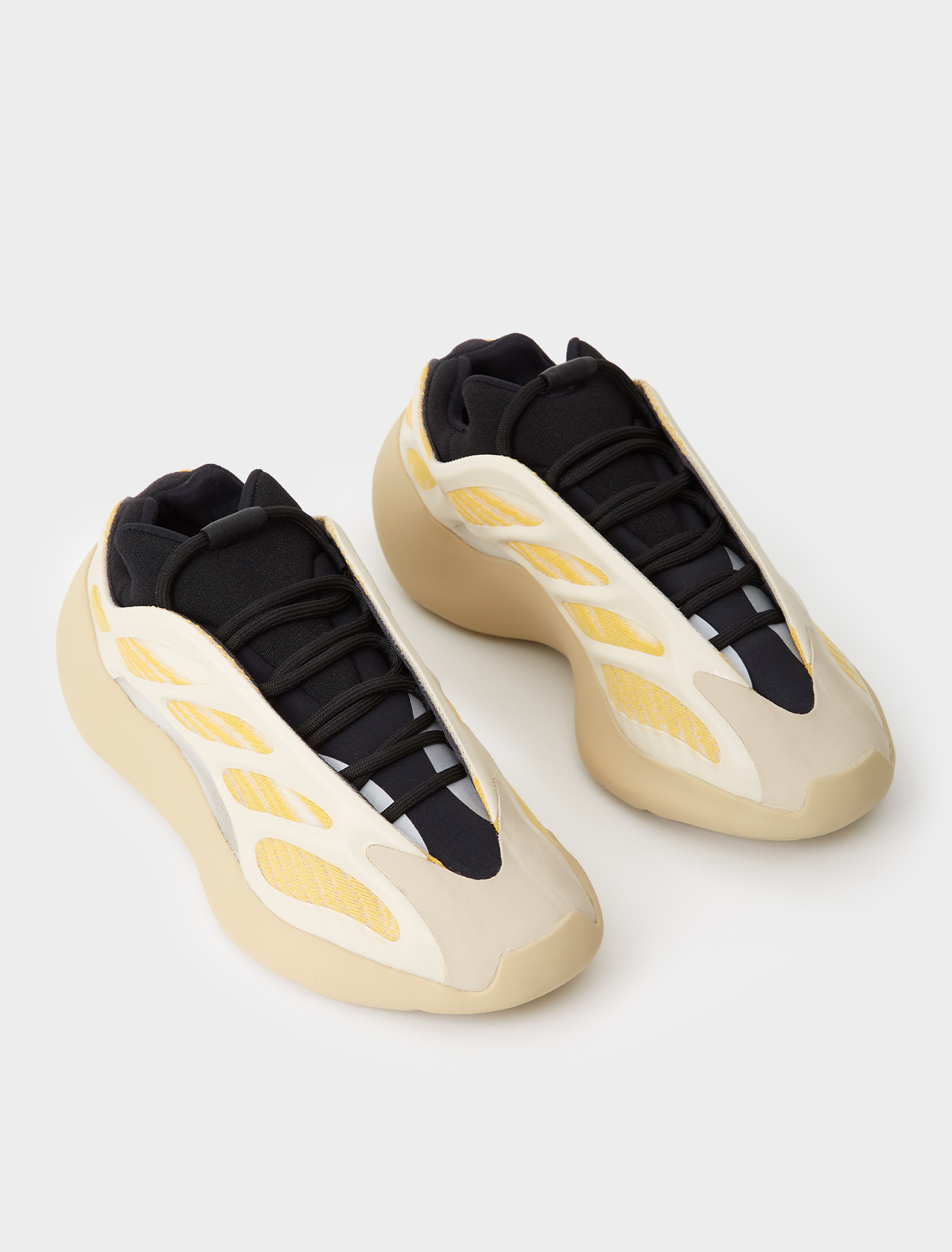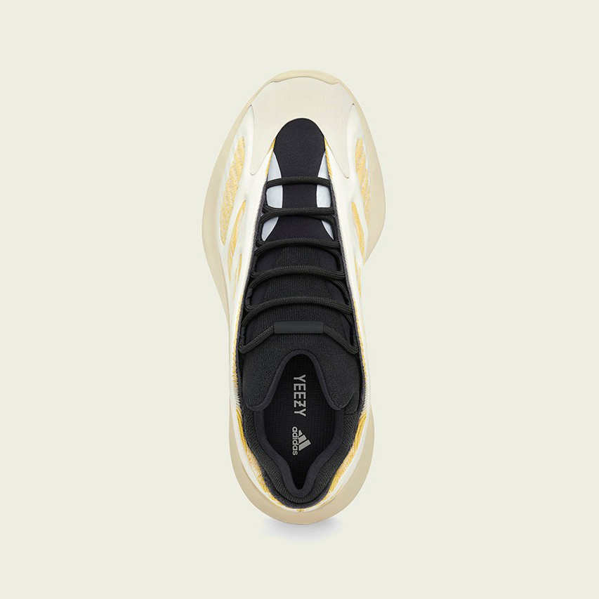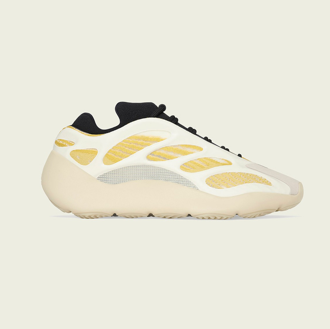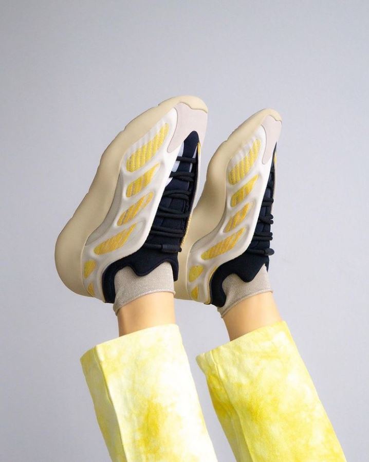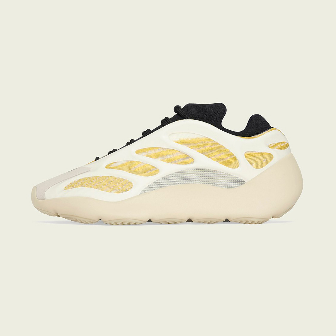 adidas Originals 與 Kanye West 共同打造的 YEEZY BOOST 700 V3 今番迎來最新配色「SAFFLOWER」,以檸檬黃單絲編織網布與奶油白 TPU 支架為鞋身主體,配靴型鞋筒結構,提升耐用度與穩定性,TPU 支架的夜光功能則為鞋款增添幾分星際異形美學。無綁帶的彈性鞋帶系統提供穿脫便利性,同時另附上一組一般鞋帶可供替換;EVA中底增強穿著的輕便度與舒適感,人字型橡膠大底則增加了防滑摩擦力。