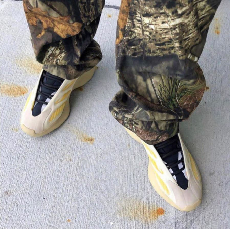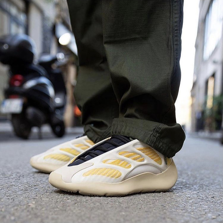 YEEZY BOOST 700 V3 與前兩代不同的是,有著黑色襪套般的內襯與流線編織鞋面外,而鞋款一大亮點就是鞋面那簍空並帶有夜光效果的白色TUP,其支架的特殊線條表現方式完全體現了 Kanye West 的獨到美學。700 V3 中底搭載 EVA 泡沫技術,雖然是非前兩代的 BOOST 緩衝底,但一樣具有輕盈、舒適的腳感回饋。