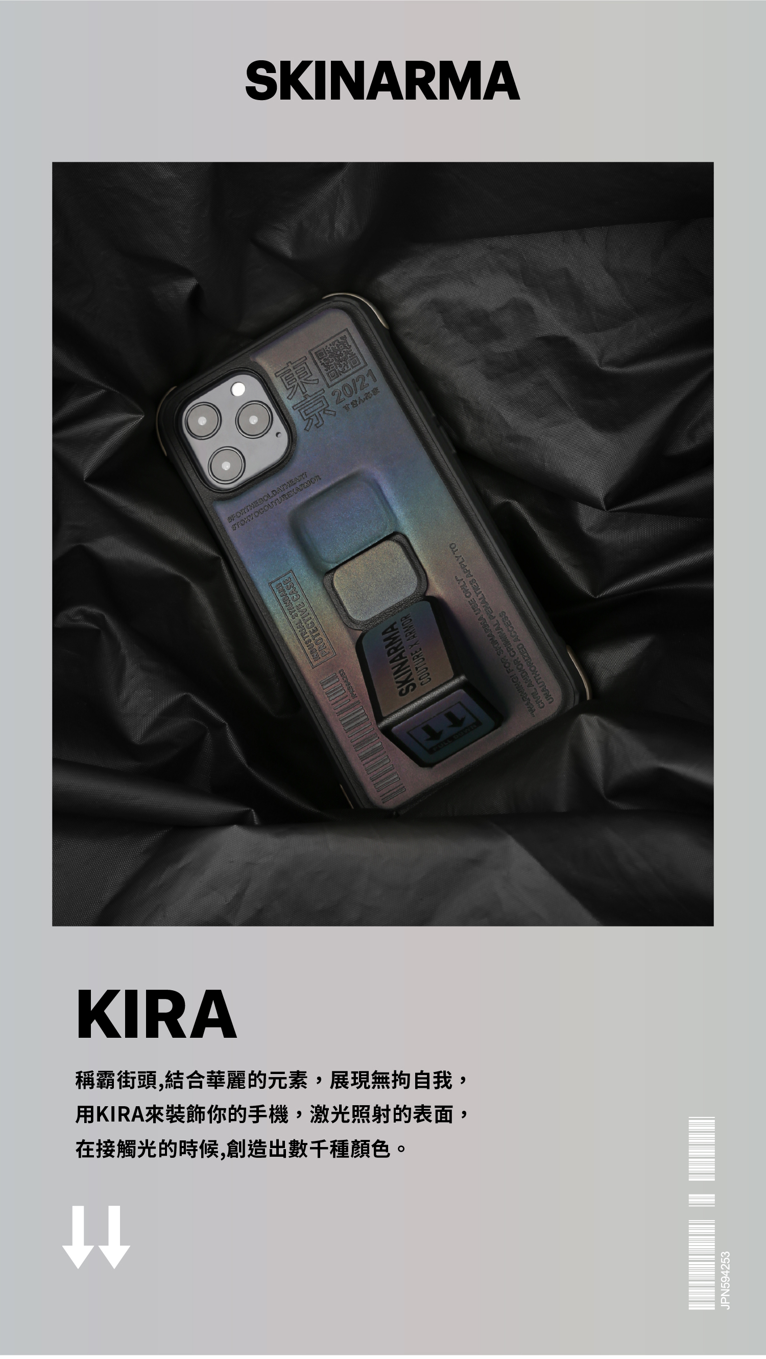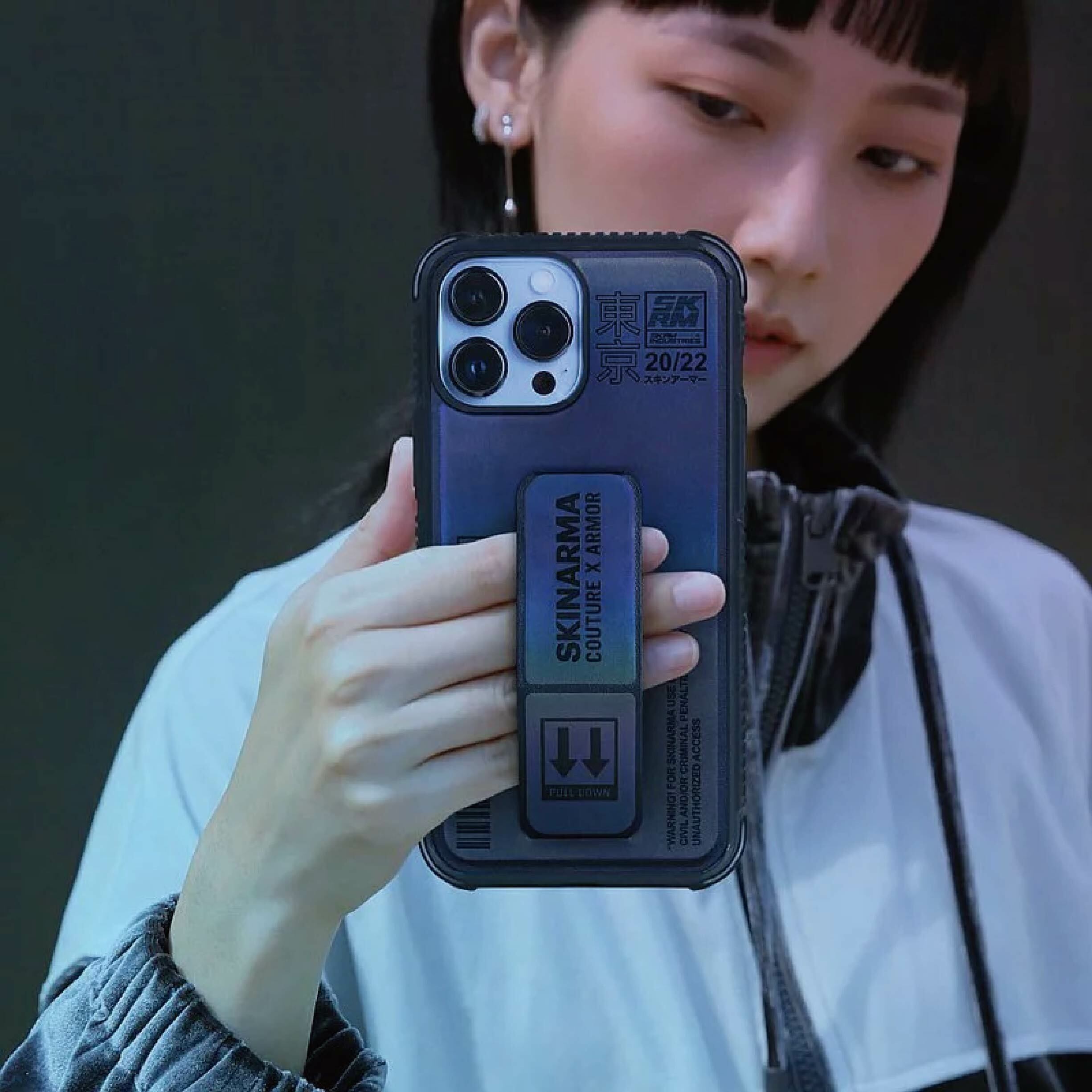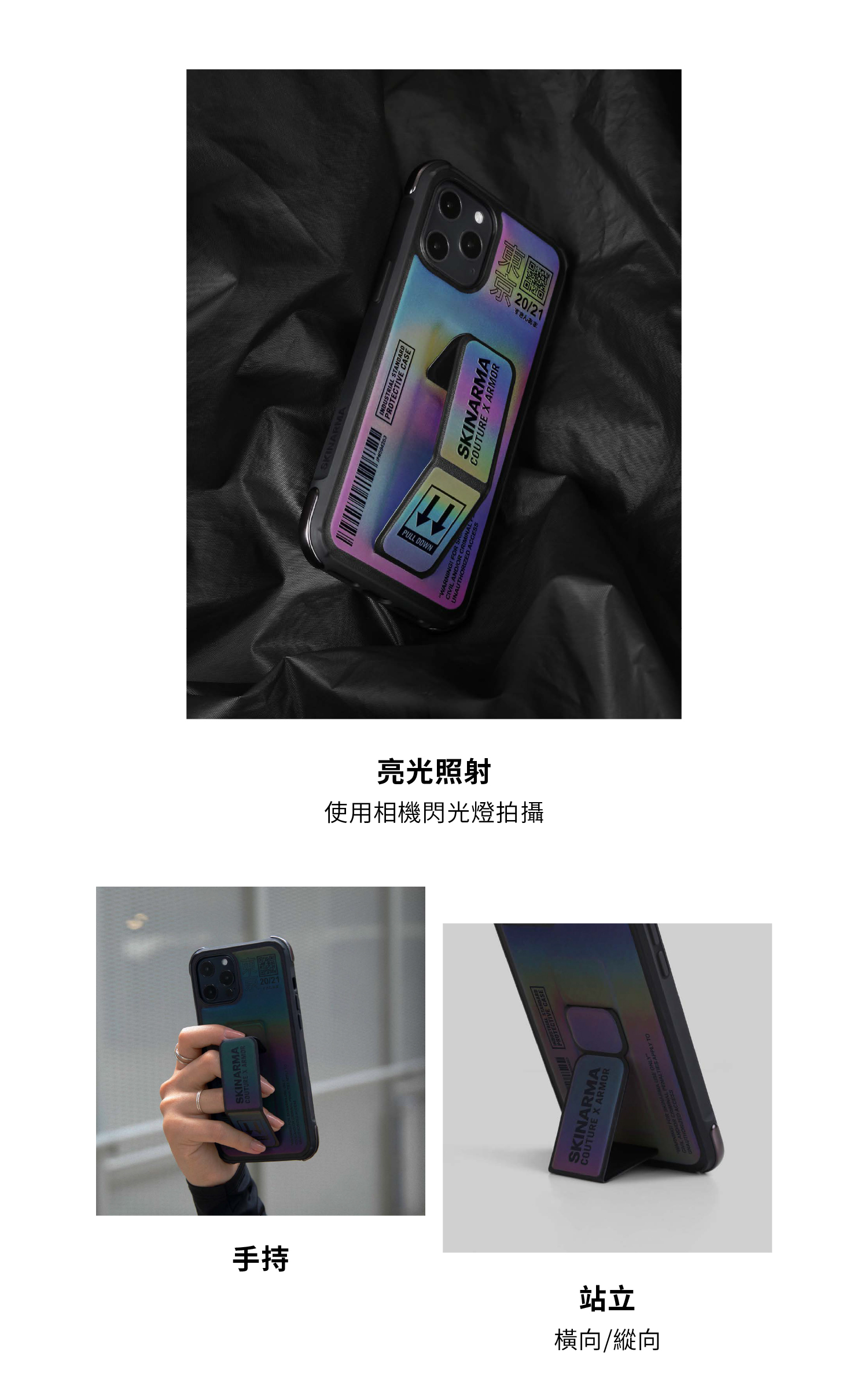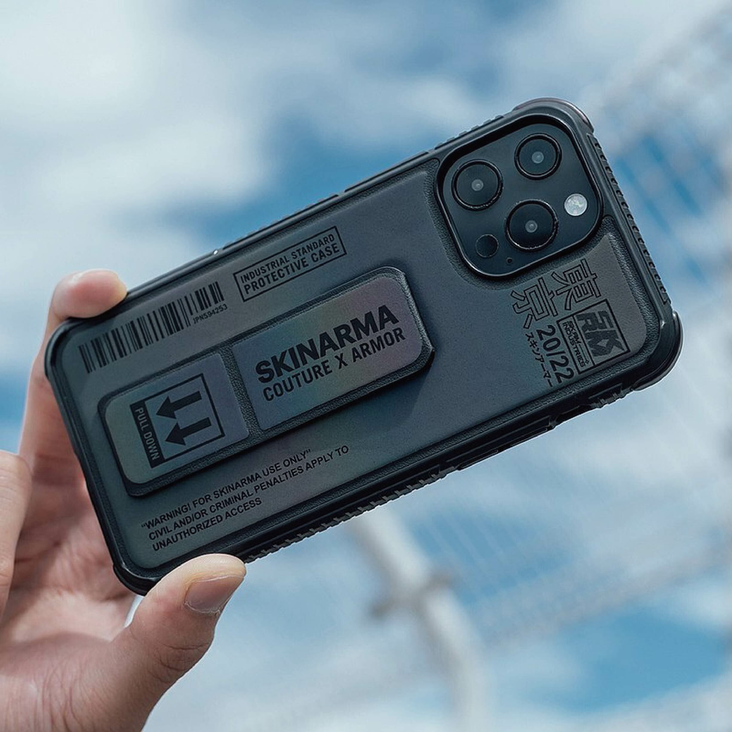 SkinArma手機殼 - 不僅融入一直非常流行的大LOGO標語元素,潮流感十足!隱形支架不只好看、有質感,更具有立架、手掌帶功能,而手機殼本身防護上,也有3米摔落的水準,四角都加強防護,鏡頭孔加高、正面四邊也高於螢幕,完全沒有忽略手機保護殼的功能性,可說是視覺、實用都兼具!