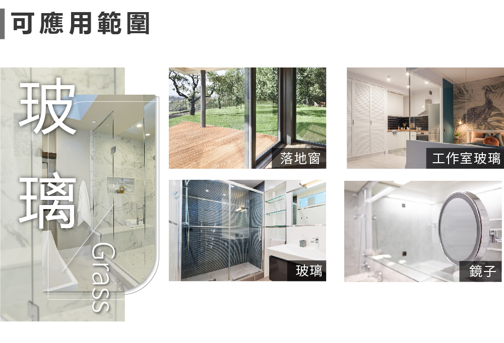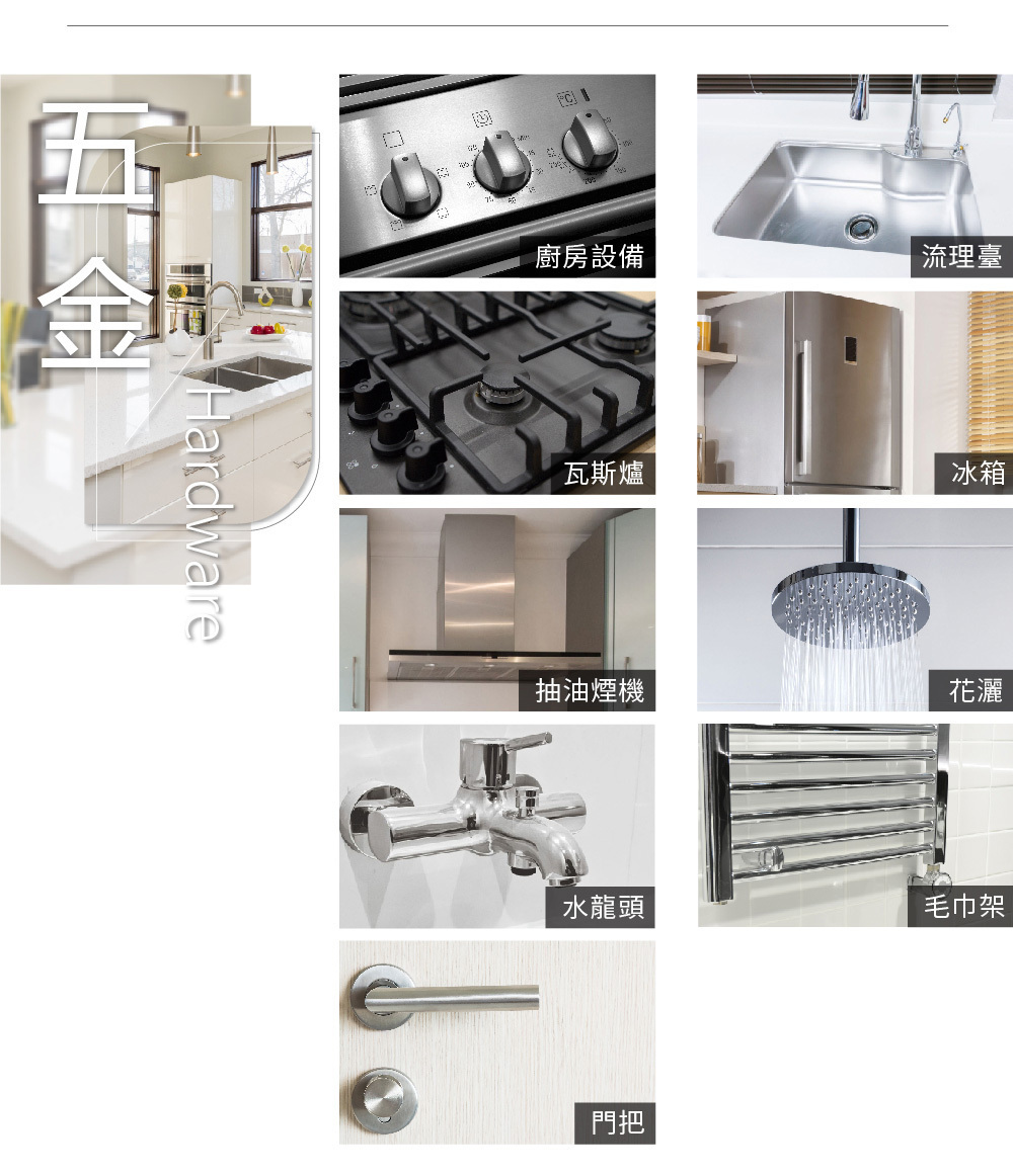毛巾桿、鍍鉻水龍頭、玻璃、塑料、陶瓷面盆、不銹鋼水槽、拋光大理石、烤漆、人造石流理台、拋光磁磚、金屬門把等
