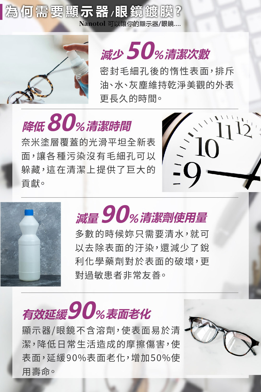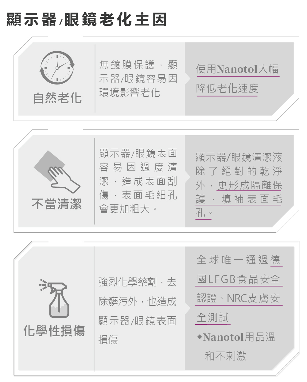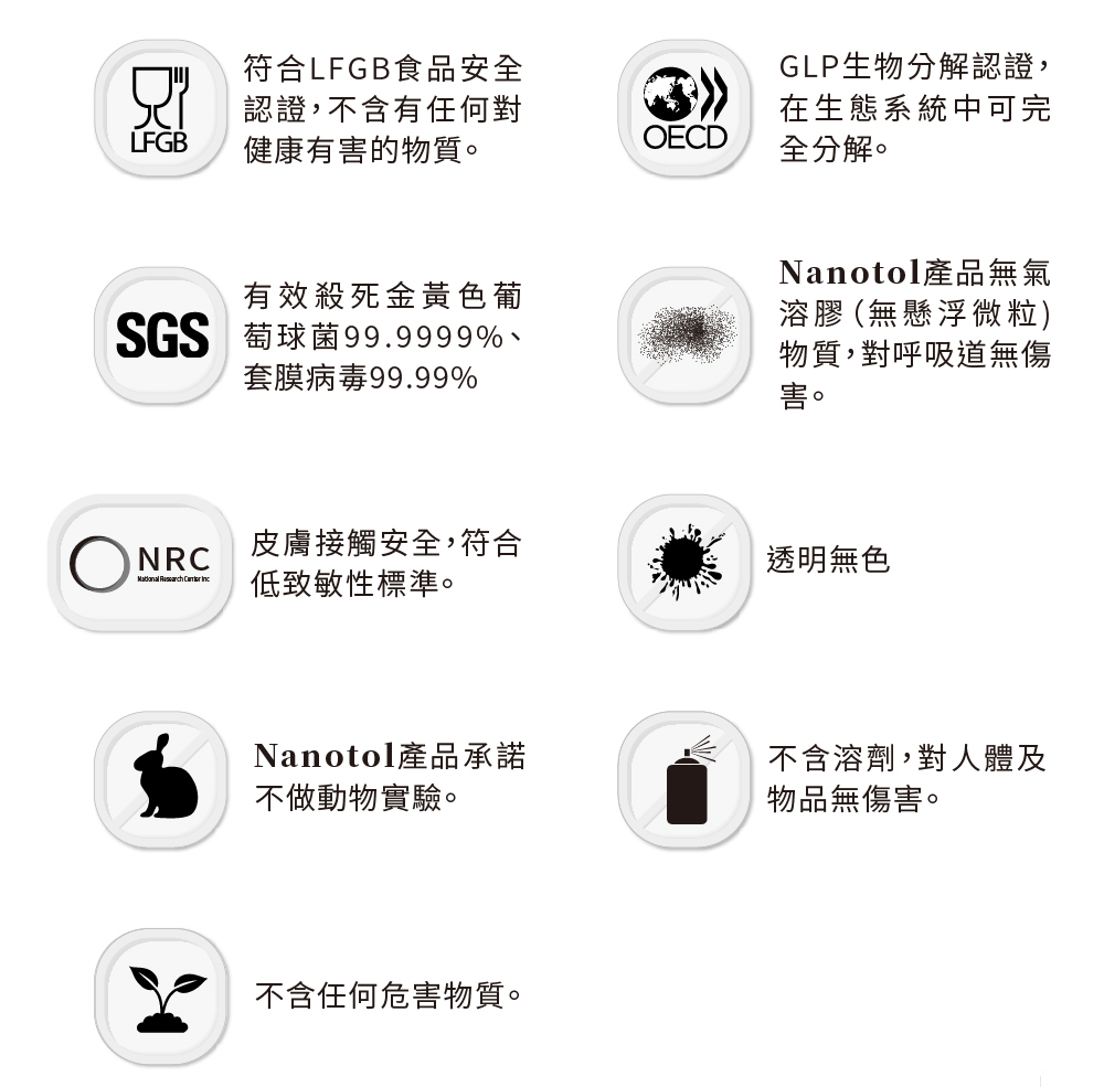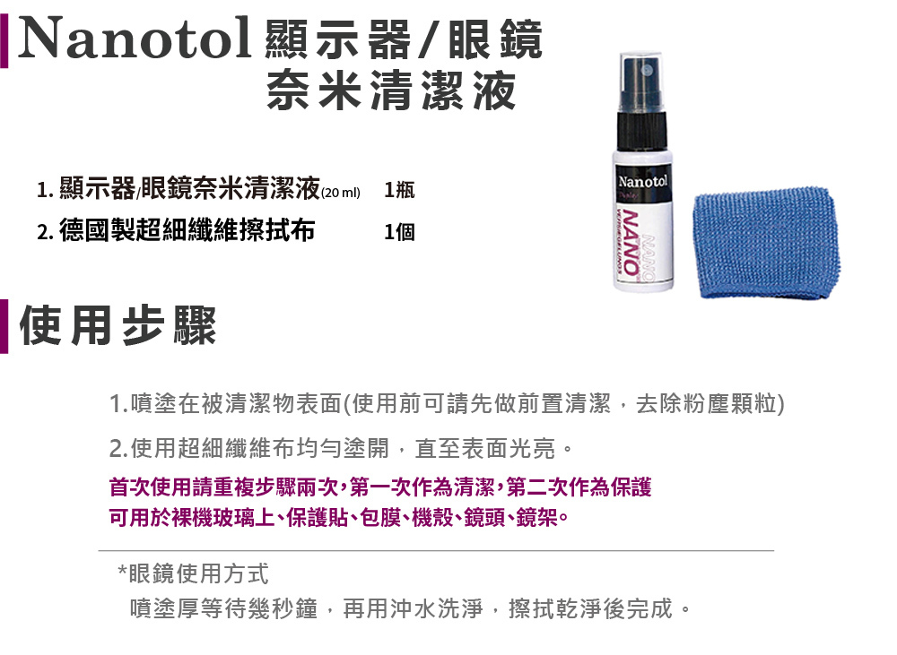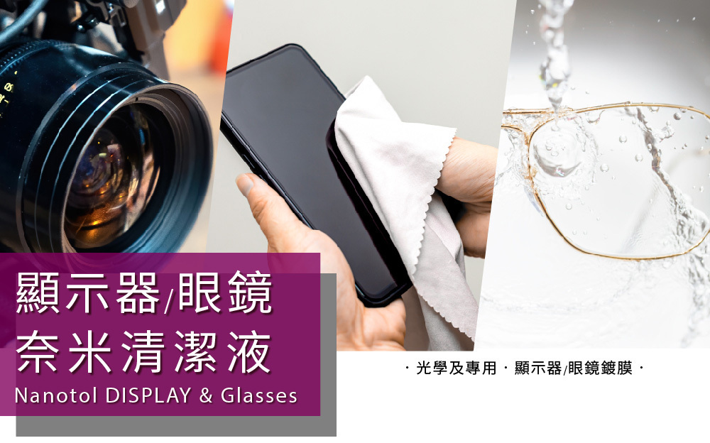 Nanotol 不含任何酒精、有機溶劑,因此可用於所有敏感表面、光學等級鏡頭、3C產品、眼鏡框架而無需擔心
