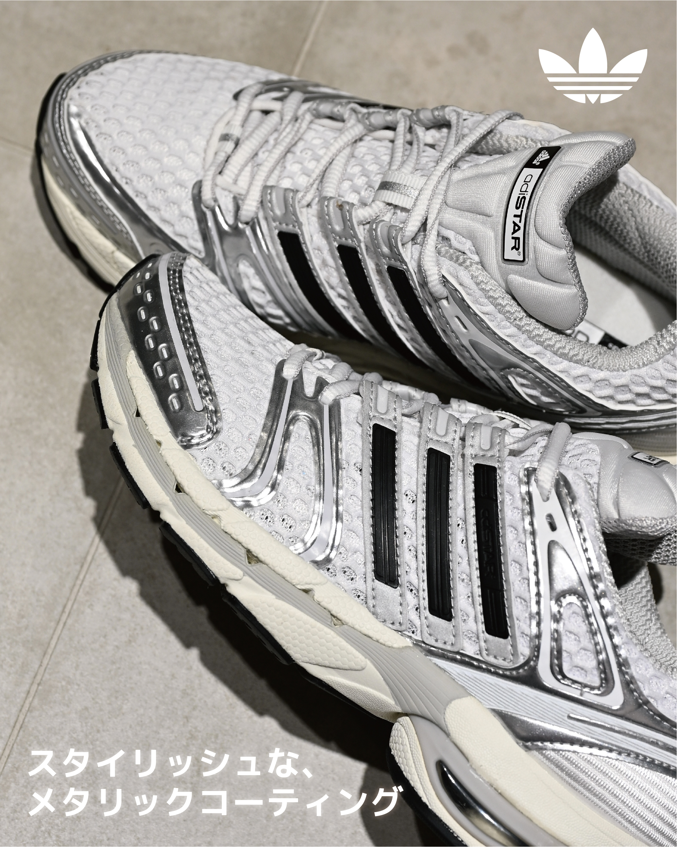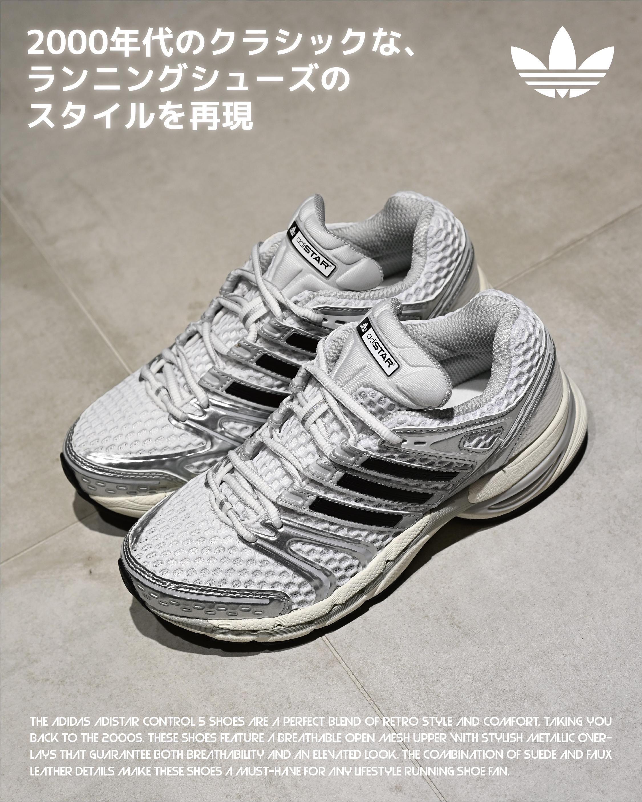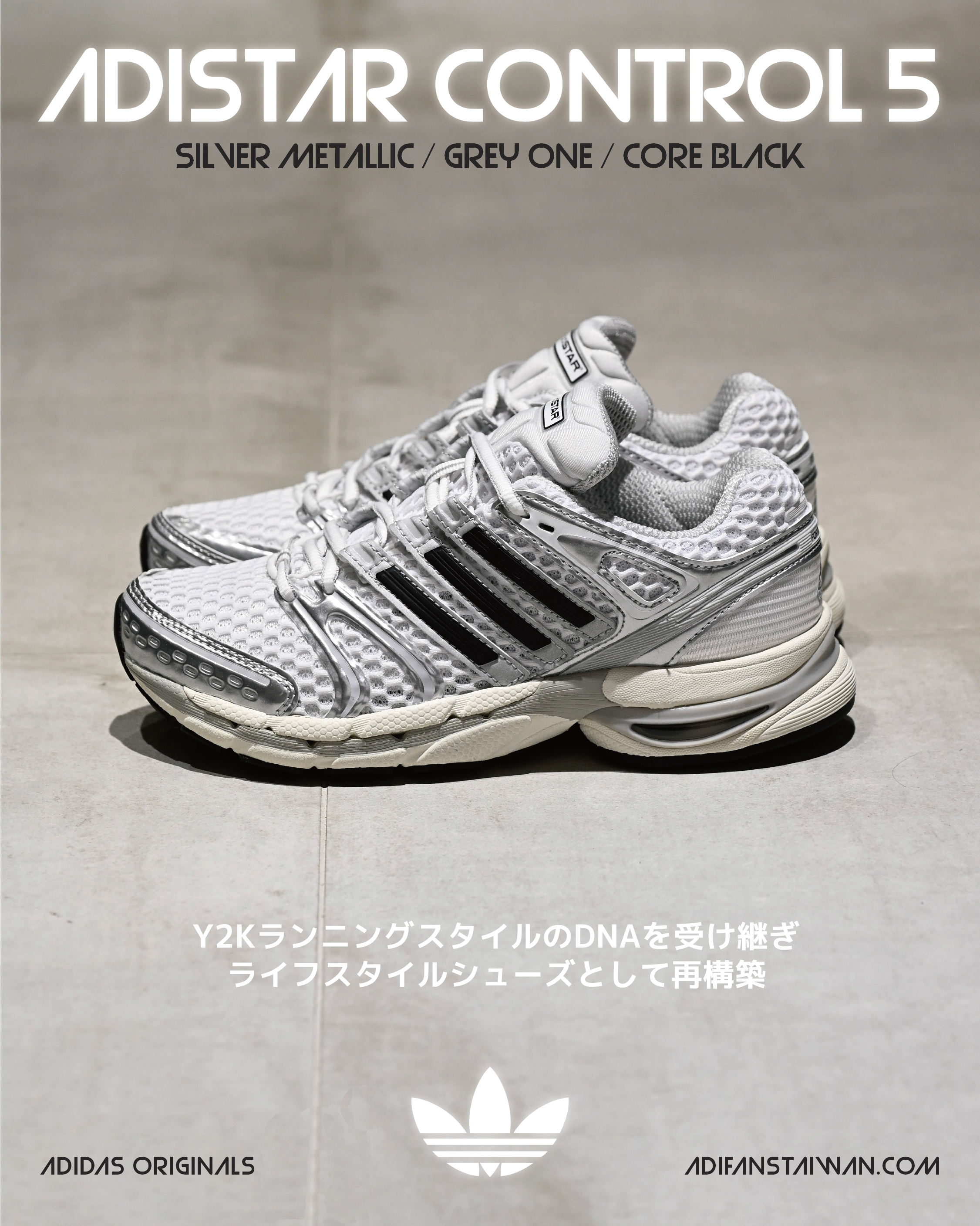 ★ adidas Adistar Control 5 重現 2000 年代經典跑鞋風貌。鞋面以開放式網布搭配金屬銀色細節,並加上合成材質的三條紋設計,營造出鮮明層次感。