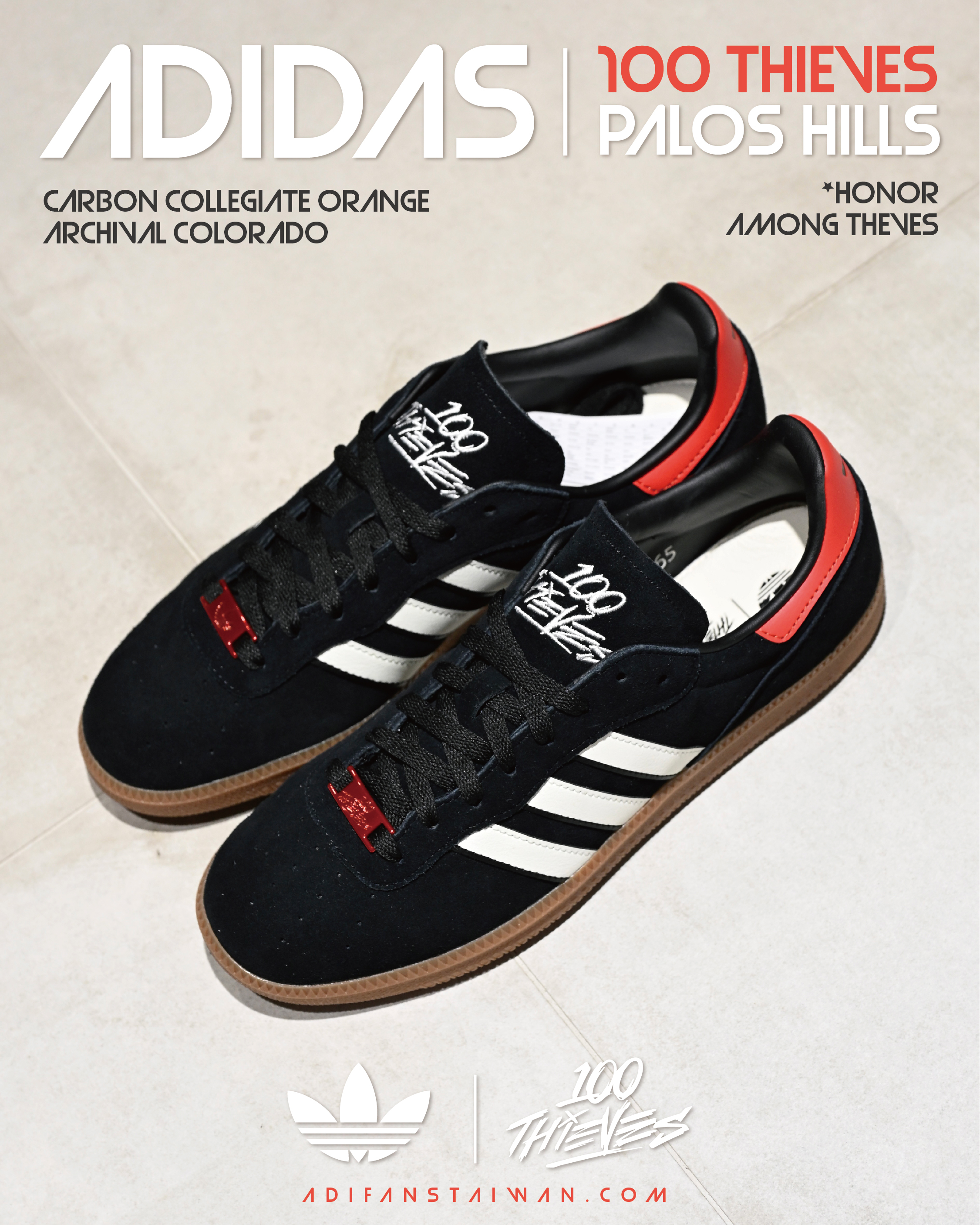 ★ 100 Thieves x adidas Palos Hills "Carbon Collegiate Orange" 採用經典 Colorado 鞋型為基礎,推出全新輪廓。這款低筒鞋以黑色麂皮鞋面打造,並以白色皮革三條紋形成鮮明對比。