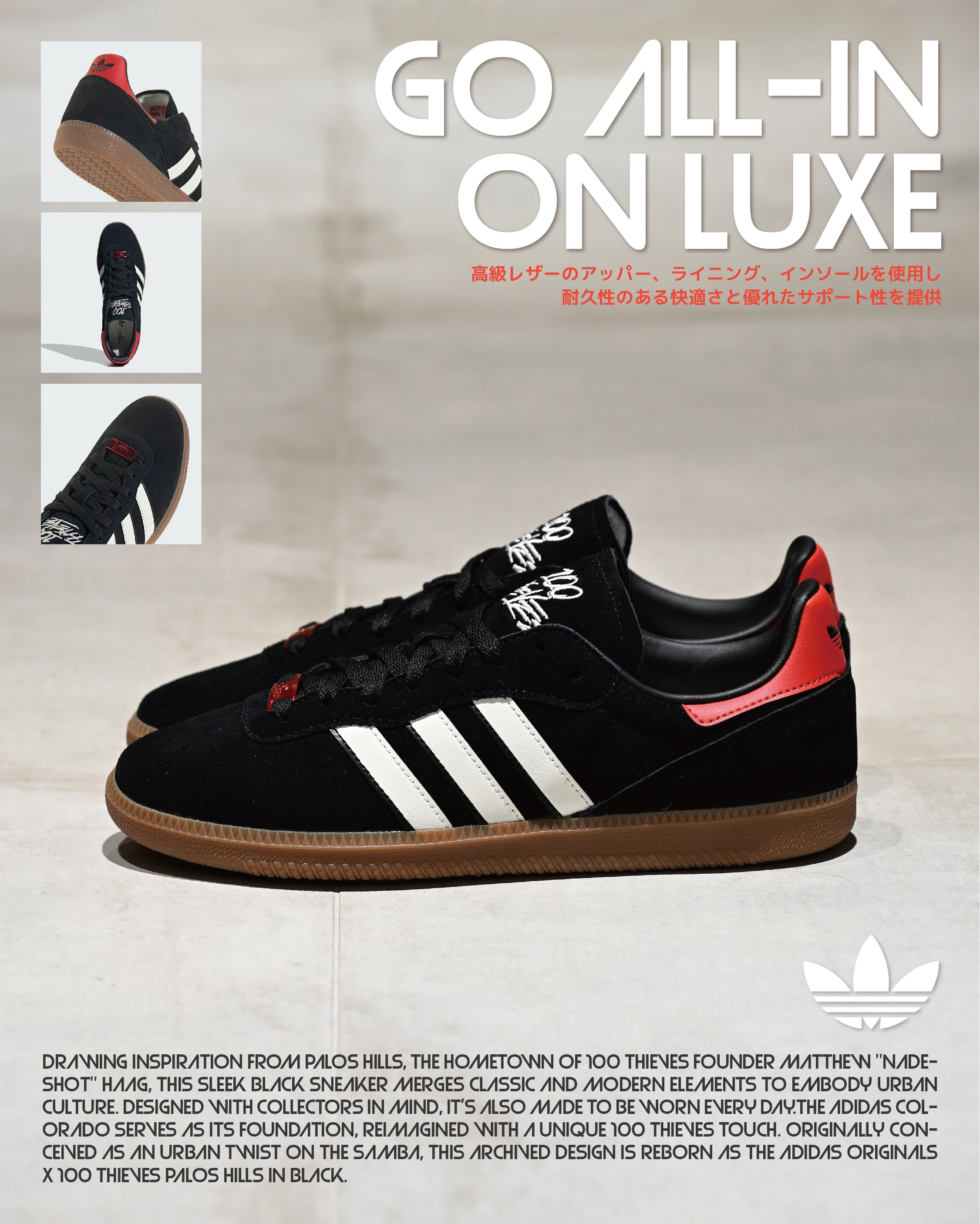 ★ 鞋跟配有亮紅皮革後標,點綴 adidas 三葉草 Logo,而鞋舌上則繡有 100 Thieves 標誌。鞋墊上同時展現雙方品牌標誌,彰顯聯名身份。整體以耐磨的膠質橡膠外底作為支撐,兼具質感與實用性。