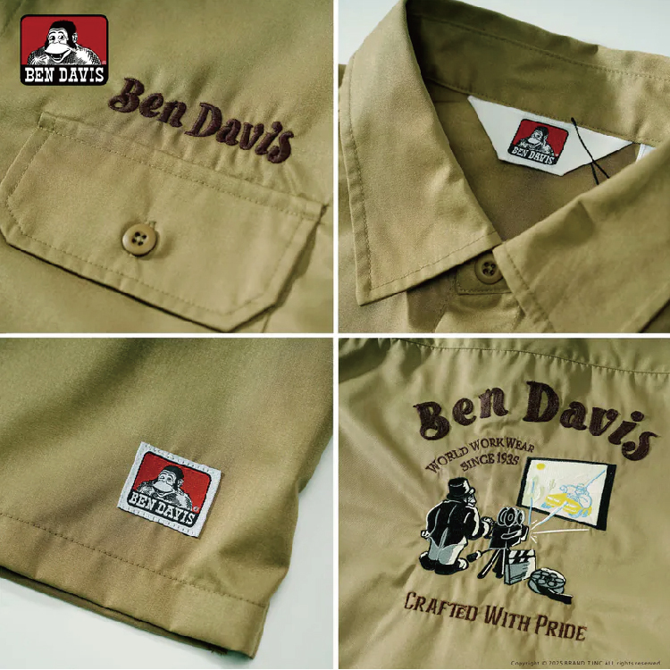 這款襯衫以「電影館放映師」為靈感,胸前刺繡出身穿紳士服、操控放映機的經典猩猩圖樣,充滿懷舊趣味與品牌標誌性的幽默感。主體面料採用聚酯纖維與人造絲混紡的斜紋布(Twill),呈現出細緻微光澤質感,兼具挺度與舒適度。下擺設計為俐落的方形剪裁,兩側開衩細節讓穿著時的層次與活動性更佳,整體版型在工裝風中保留了 BEN DAVIS 一貫的現代俐落輪廓。