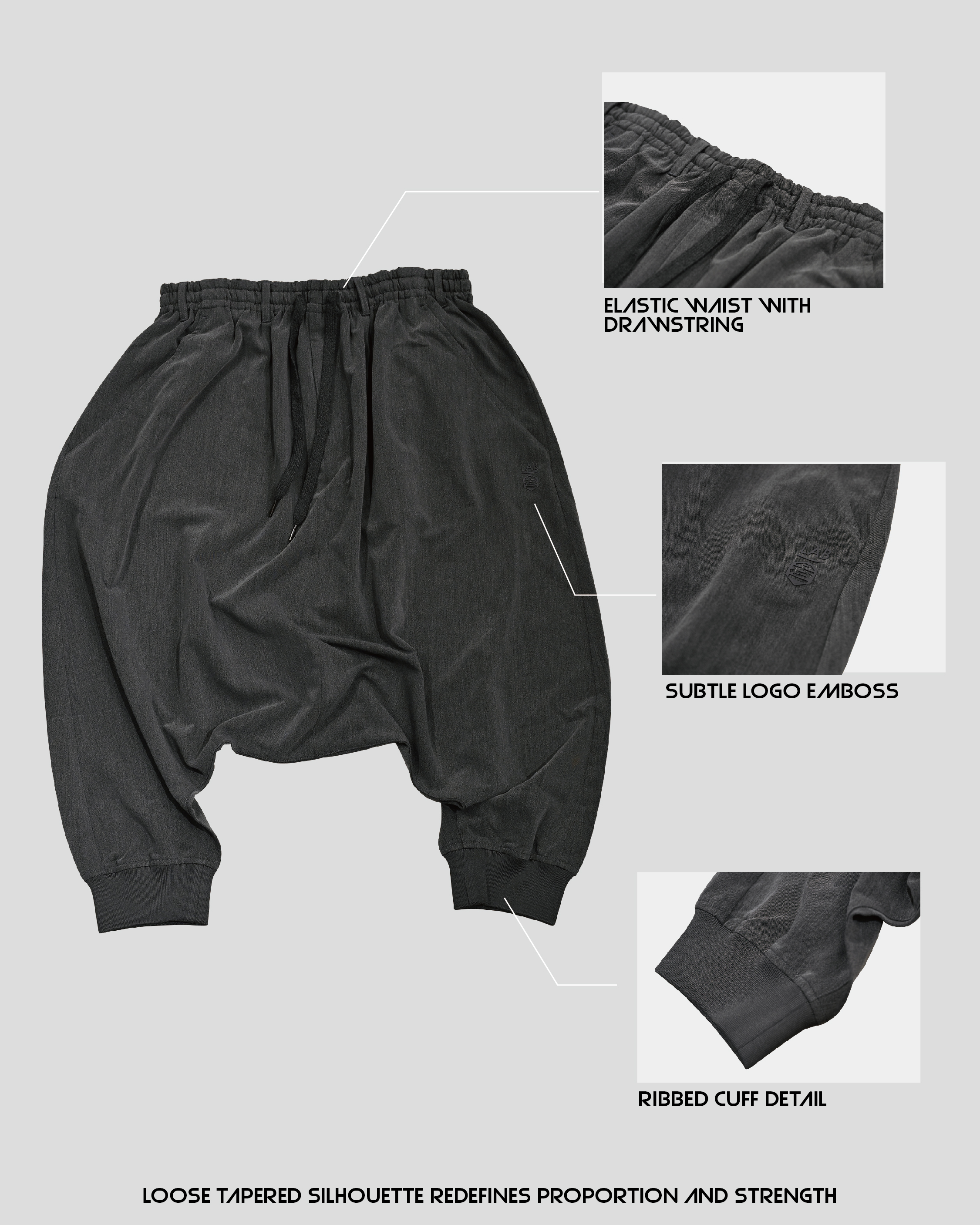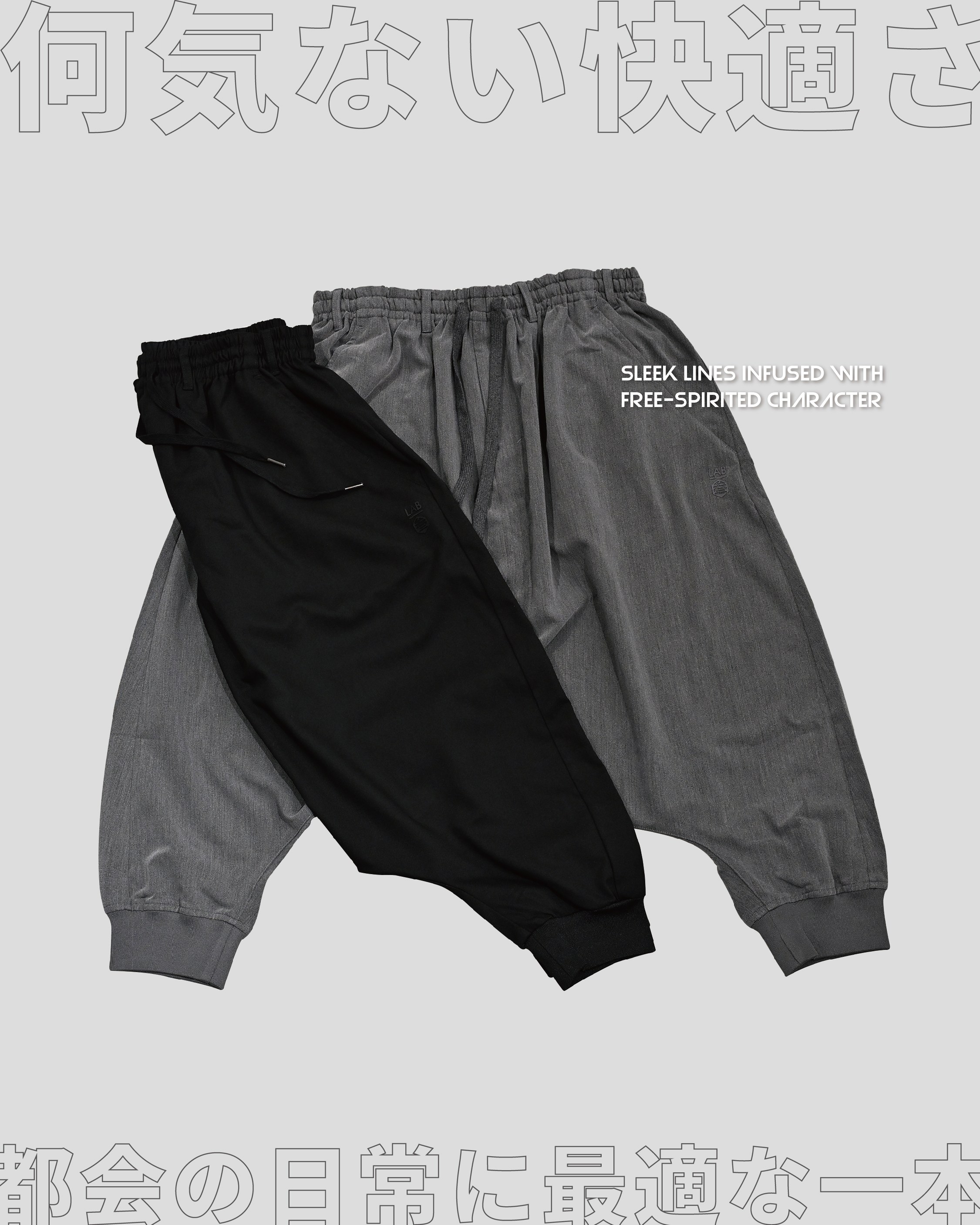 以寬鬆輪廓搭配收束褲腳,呈現俐落卻自在的現代氣息。布料隨步伐自然垂墜,塑造出充滿流動感的立體線條。鬆緊腰頭與抽繩設計,讓舒適與調整性並存。