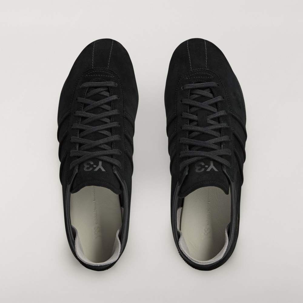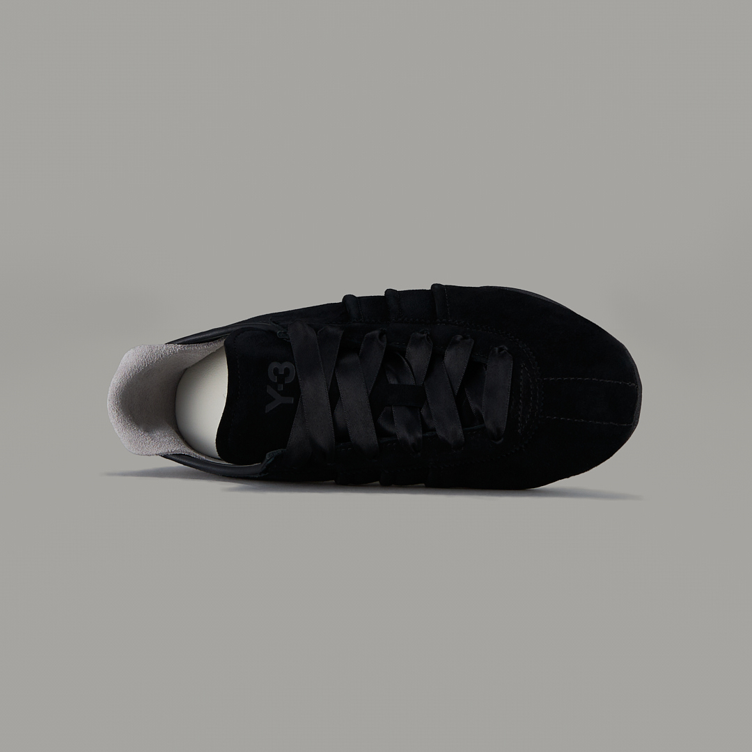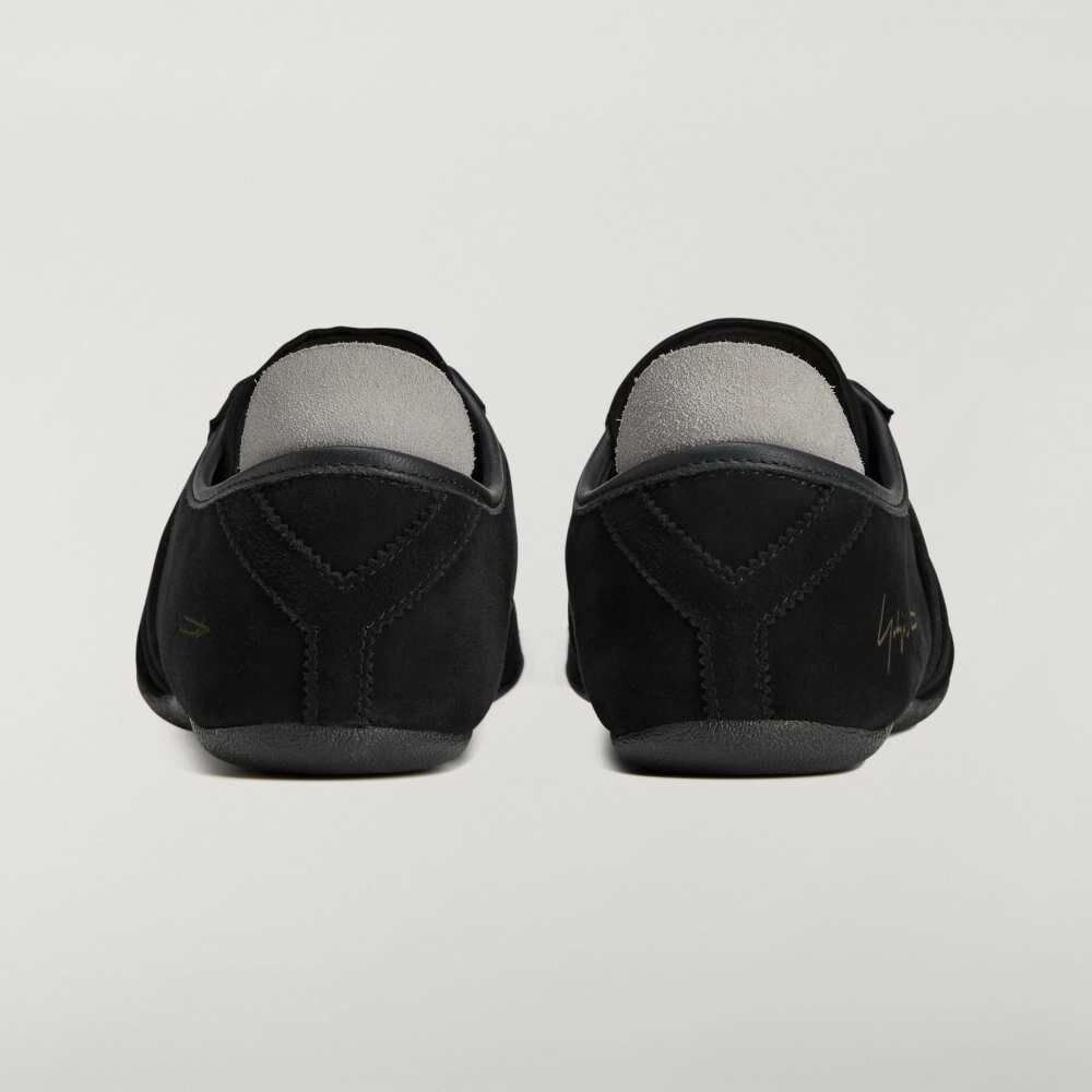側面飾有經典三條線,鞋舌上壓印 Y-3 標誌與 Yohji Yamamoto 簽名,鞋跟則以獨特的 “Y” 造型細節作為視覺亮點。