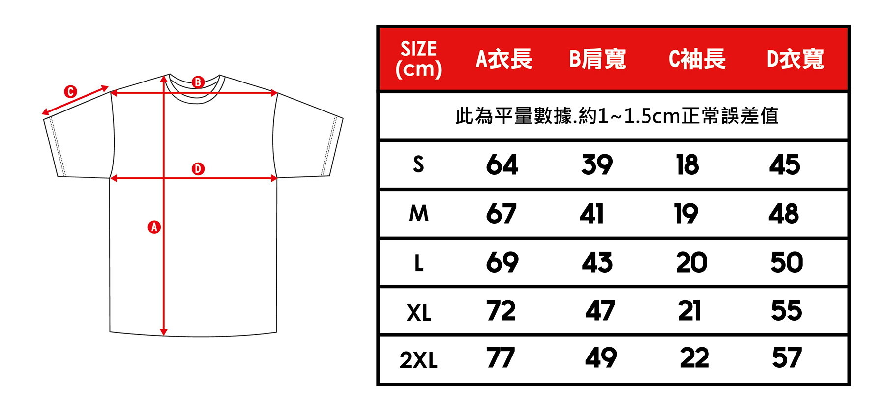 XXL: 衣長平量77cm/衣寬平量57cm/袖長平量22cm/肩寬平量49cm