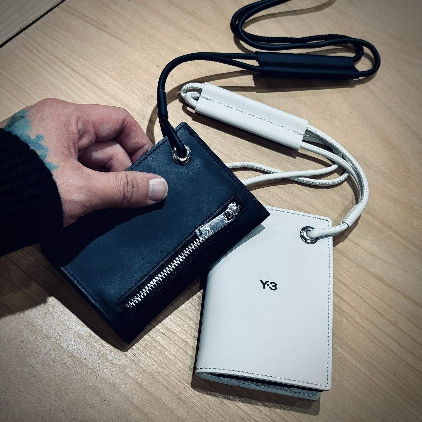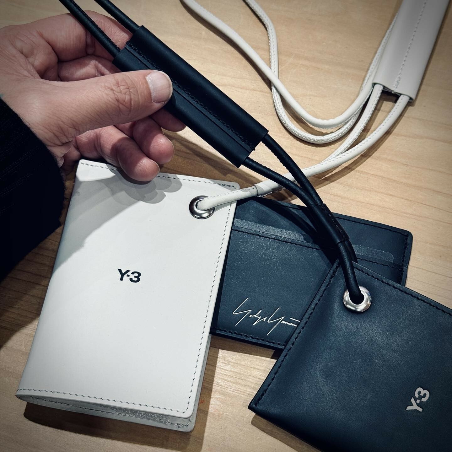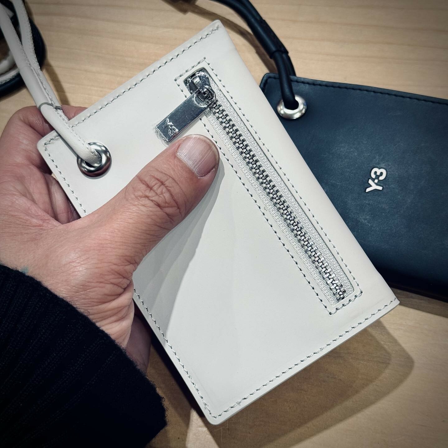 高品質皮革配件,封面中央有與背景顏色相反的凹陷 Y-3 標誌。